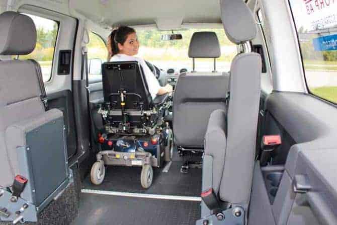 Bilanpassning i Staffanstorp vill att rullstolsburna ska strunta i färdtjänsten. Nu har man gjort Volkswagens Caddy Maxi så rymlig att två rullstolar får plats framtill.